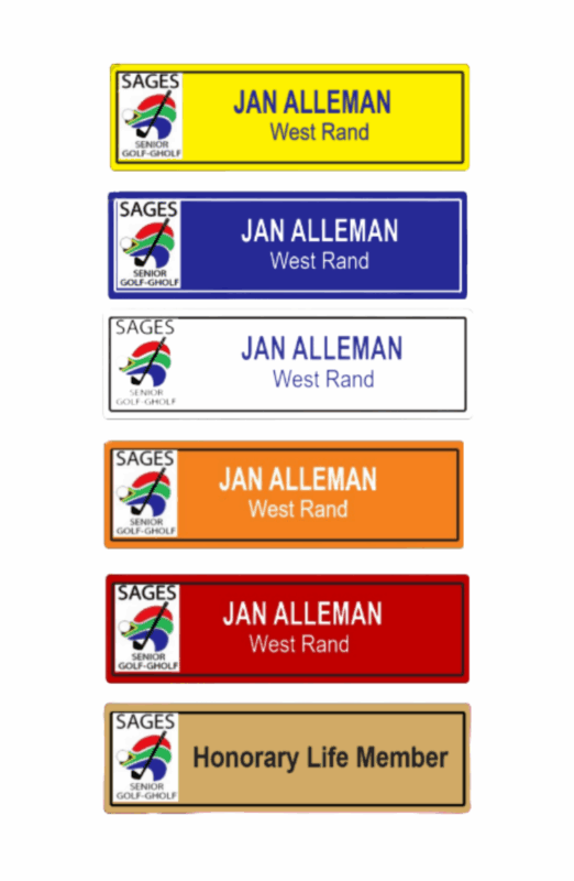 All the badges are approximately 65mm long and 20mm high, but can be enlarged to accommodate exceptional longer names. The Sages logo is on the left-hand side of the badge. The name is in BOLD CAPITALS, aerial 18 point, and the branch name is in lower case bold aerial 14 point. A thin line borders all the badges. It has the same colour as the lettering on the badge. The badges are made of granule material 3mm thick. The fastening mechanism is magnetic.